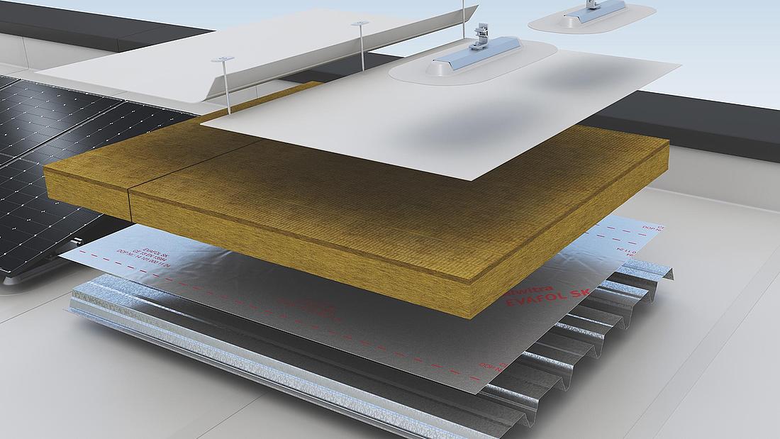 Durch die Kombination entsteht ein innovatives Hybridsystem aus einer Hand mit schlanker Aufbauhöhe, geringem Gewicht und hoher Druckbelastbarkeit – und das als Teil eines kompletten Dachaufbaus.