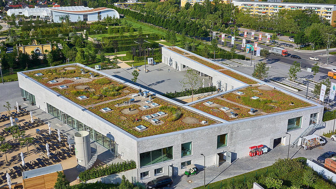 The German Roof Gardeners Association, in cooperation with trade and industry partners, has installed various biodiversity modules turning the nearly 2,000 m² of roof area into an experimental field for biodiversity. Importantly, various layout measures as well as consideration of basic biodiversity principles are particularly important for promoting the biotope function of green roof areas. On the visitor centre rooftop, a variety of different biodiversity modules is complementing the conventional extensive green roof, including height modulation of the topsoil layer, substrate quality enhancement, unvegetated areas such as sand flats and gravel patches, temporary water areas, special plant selection, nesting aids for insects and dead wood piles. These measures are expected to help the roof of the visitor centre over time to develop into a particularly species-rich and ecologically valuable habitat. Visitors can enjoy the roof from a platform next to the building.