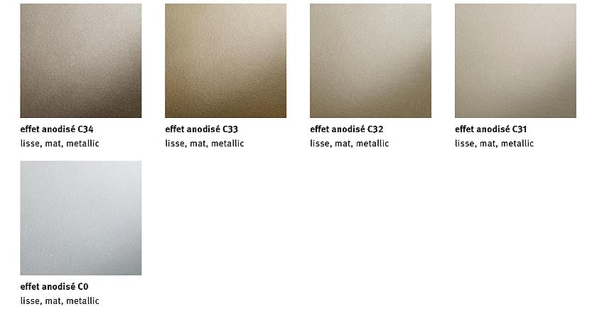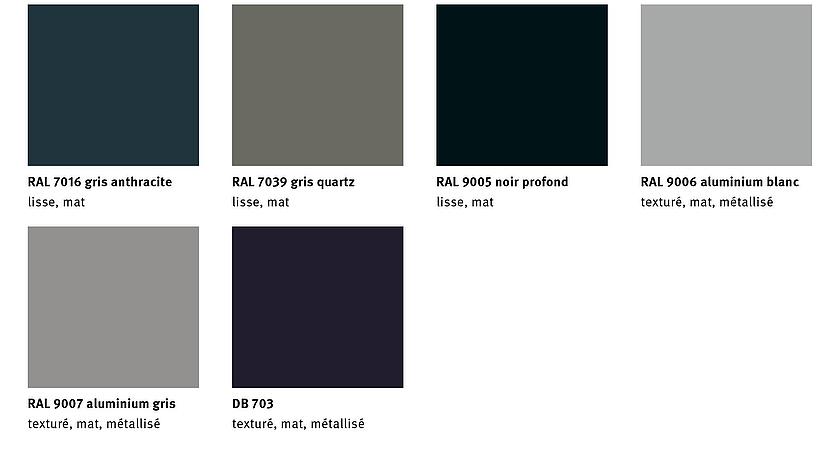 Des contrastes garants de la longévité. Notre gamme de couleurs nous permet de proposer des solutions personnalisées convenant à chaque projet et à tous les goûts. Grâce à nos couleurs préférentielles à haute résistance aux intempéries, nous pouvons nous assurer que les couleurs conservent leur éclat comme au premier jour, même après des années. Notre palette comprend des couleurs aussi bien classiques que modernes, pour satisfaire tous les goûts. Notre capacité à reproduire toutes les couleurs RAL CLASSIC en qualité conforme à la norme pour façades (standard GSB) nous permet de concrétiser vos idées de coloris. C’est possible grâce à nos couleurs préférentielles alwitra select (HWF, GSB-Master), disponibles en permanence, à haute résistance aux intempéries. alwitra select plus fournit les effets recherchés. NOTEZ CEPENDANT QUE : Les échantillons sont affichés sur un écran. La couleur et le degré de brillance peuvent donc varier.