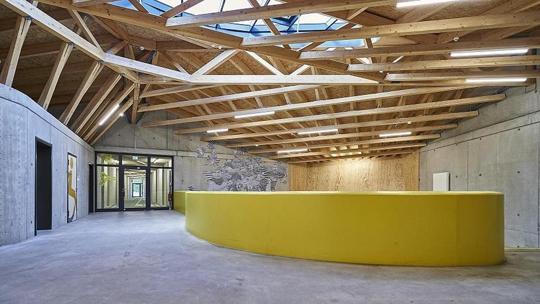L'innovation est également au cœur de l’objet construit : le bâtiment est constitué d'une structure hybride bois-béton qui a permis l'utilisation de matériaux et de techniques locaux. Les parties intérieures de la structure, c'est-à-dire les murs des couloirs et les plafonds, sont principalement en béton. Les éléments extérieurs comme la façade, la structure du toit, mais aussi les murs intérieurs non porteurs ont été réalisés en bois. Avantage de cette construction hybride : une dynamique physique optimisée et un degré élevé de flexibilité. Les éléments de construction à isolation thermique sans ponts thermiques sont principalement situés au niveau de l'enveloppe du bâtiment, tandis que les masses de stockage nécessaires se trouvent à l'intérieur du bâtiment. « Le bâtiment a été conçu pour pouvoir être utilisé de diverses manières. L'actuelle auberge de jeunesse pourrait tout à fait être convertie en jardin d'enfants, en école ou en maison de retraite », explique Tobias Wallisser.
