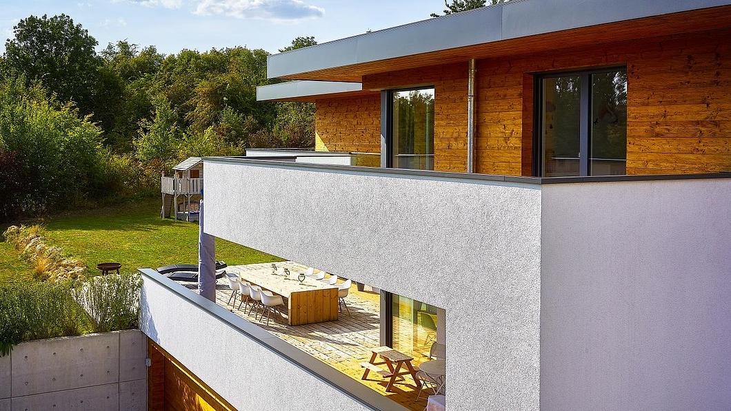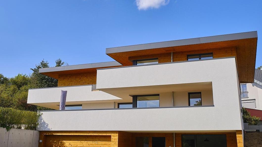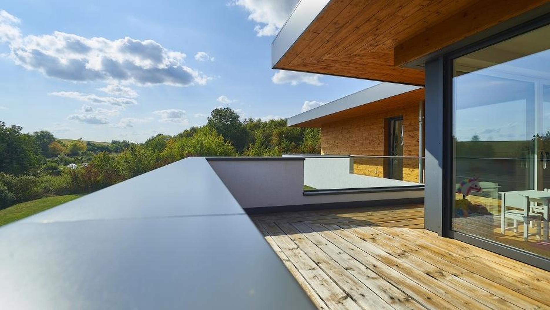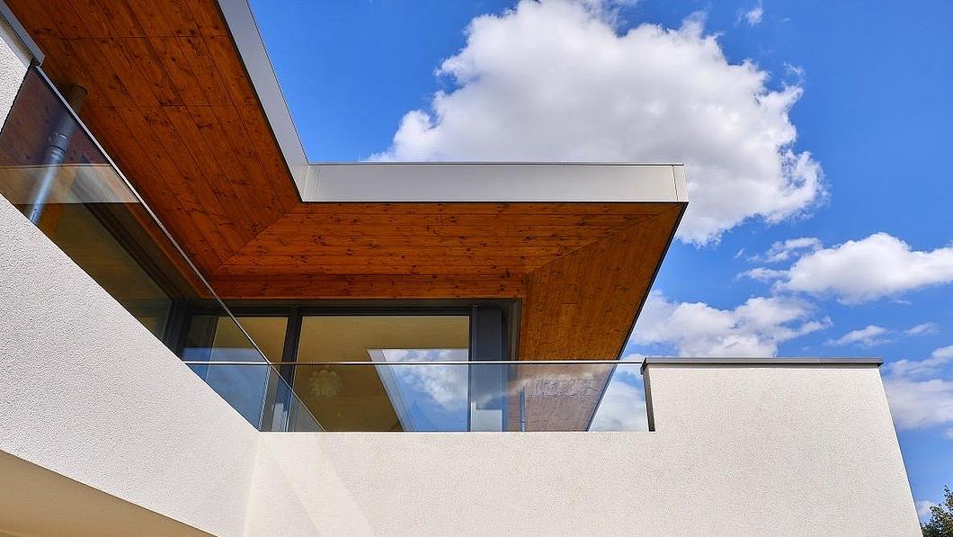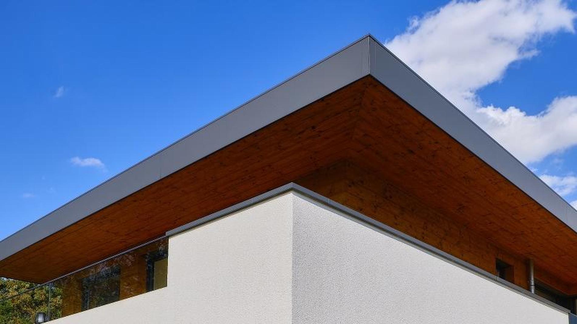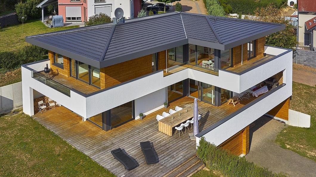 Beim Bau seines großzügigen Einfamilienhauses stand Sven Gerber Planer und Bauherr in Personalunion, vor folgender Situation: Seinem Flachdach-Entwurf stand die Vorgabe des Bebauungsplans entgegen. Seine einfache, aber wirksame Idee: Er umfasste das nur 10 Grad geneigte Walmdach mit einer hohen Attika. Dadurch erzielte des den Anschein eines Flachdachs und erfüllte zugleich die Vorgaben des Bebauungsplans.