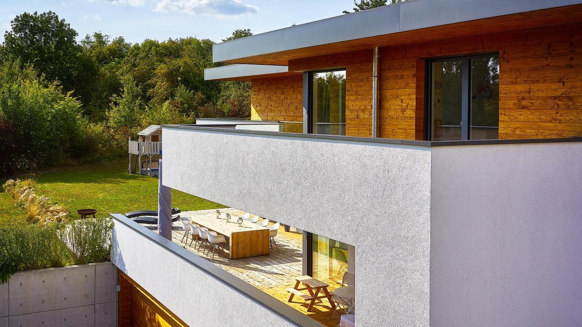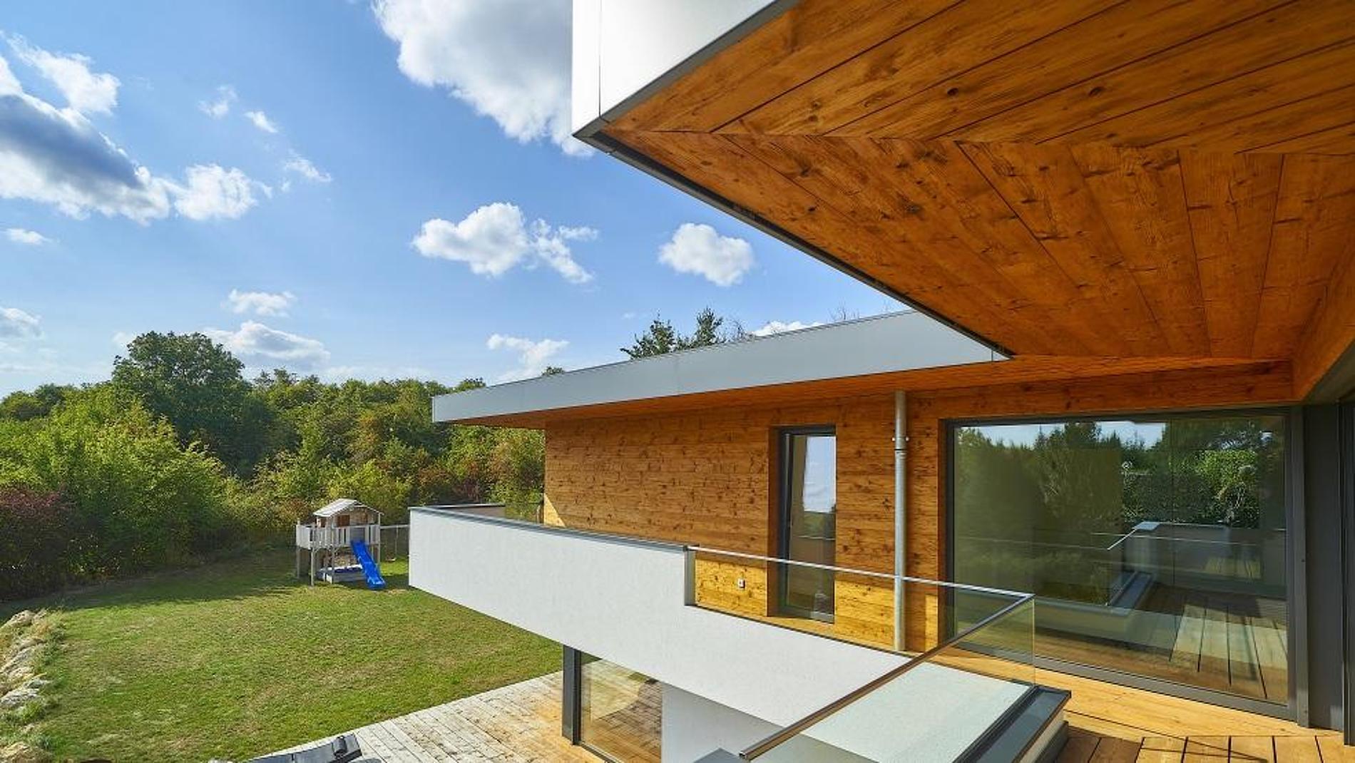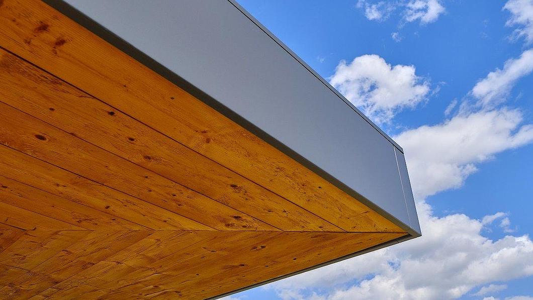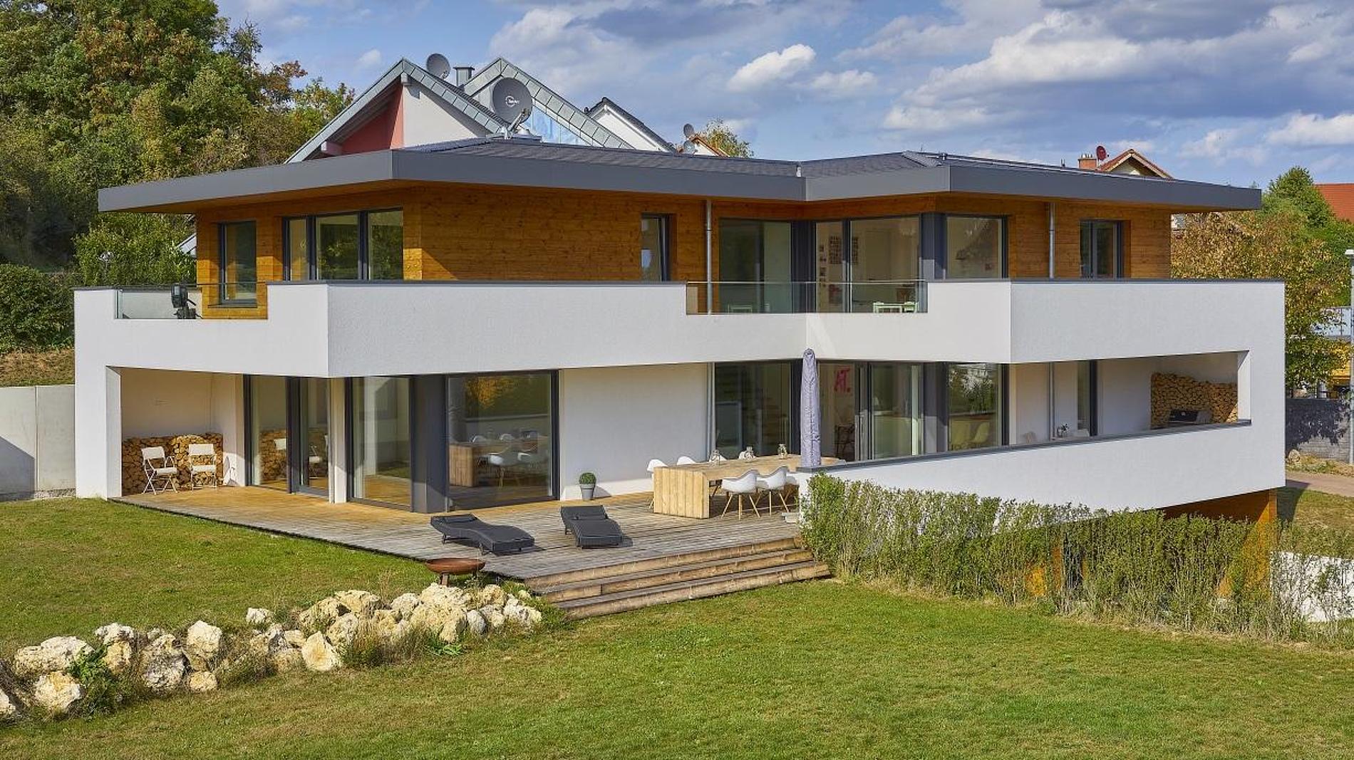 Beim Bau seines großzügigen Einfamilienhauses stand Sven Gerber Planer und Bauherr in Personalunion, vor folgender Situation: Seinem Flachdach-Entwurf stand die Vorgabe des Bebauungsplans entgegen. Seine einfache, aber wirksame Idee: Er umfasste das nur 10 Grad geneigte Walmdach mit einer hohen Attika. Dadurch erzielte des den Anschein eines Flachdachs und erfüllte zugleich die Vorgaben des Bebauungsplans.