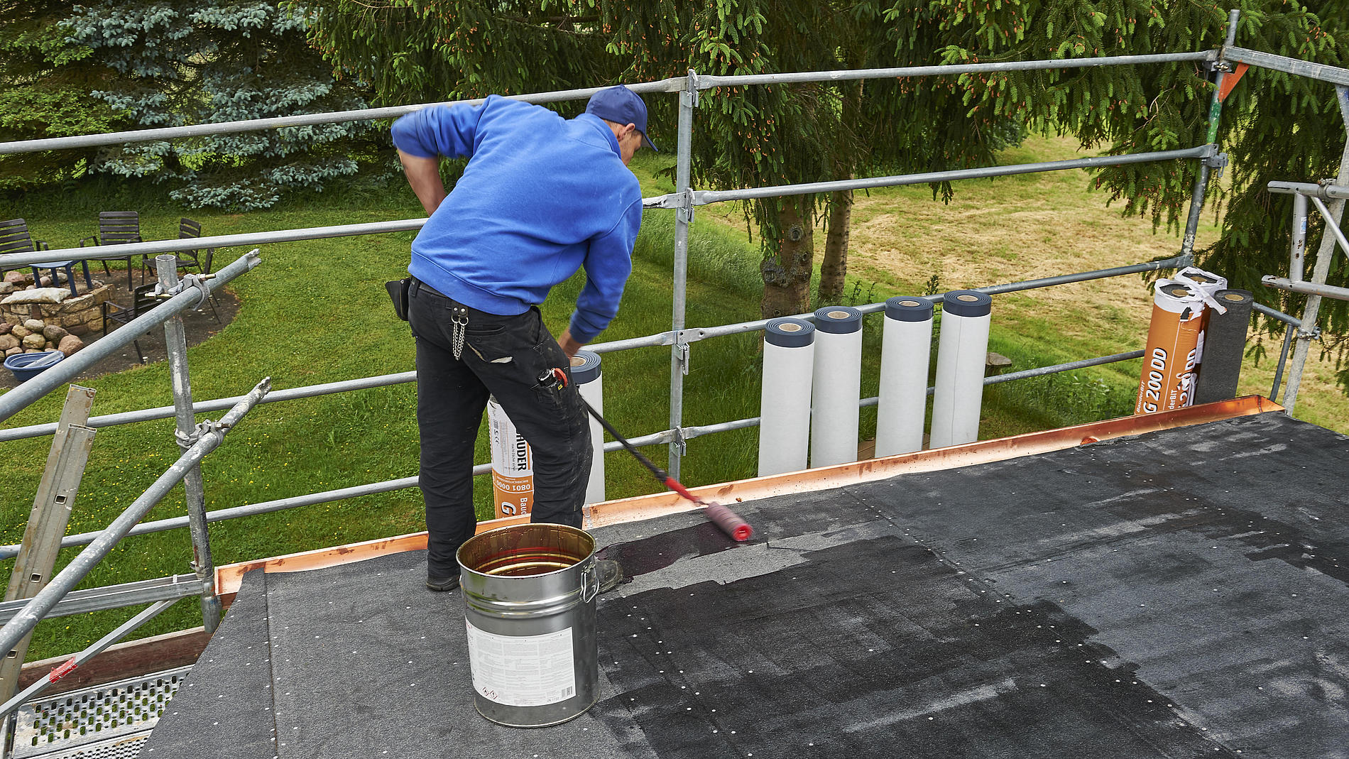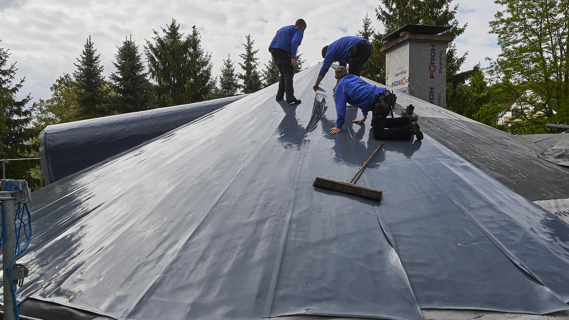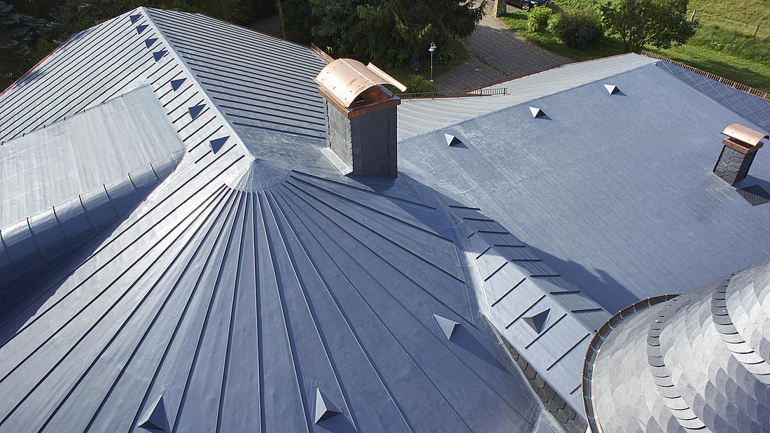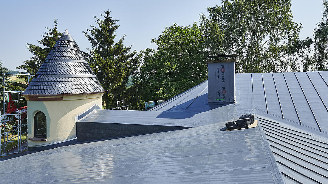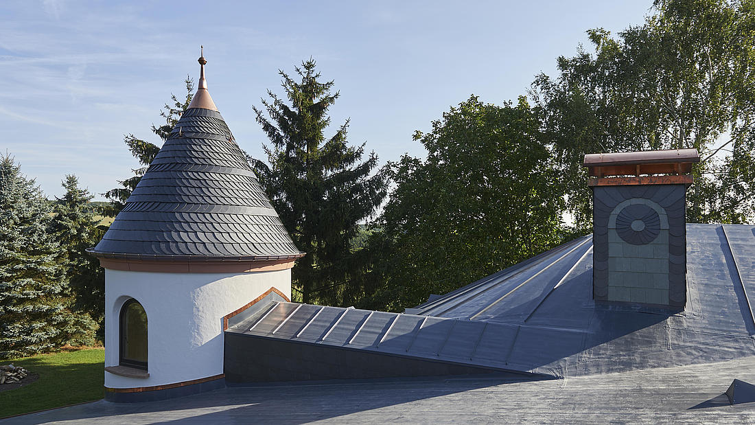 Viele geneigte Dachflächen, gerundete, fast kegelförmige Bereiche, eine markante Gaube sowie ein Turm mit Kegeldach – die Villa in Welschbillig hat eine wahrlich außergewöhnliche Dachlandschaft. In einer sechswöchigen Sanierung erhielt sie nicht nur eine neue, fachtechnische einwandfreie Abdichtung, sondern auch eine optisch markante und individuelle Note. Die Kombination aus Schiefer, Kupfer, Kunststoffdachbahn und Strukturprofilen unterstreicht den einprägsamen Charakter des Daches.