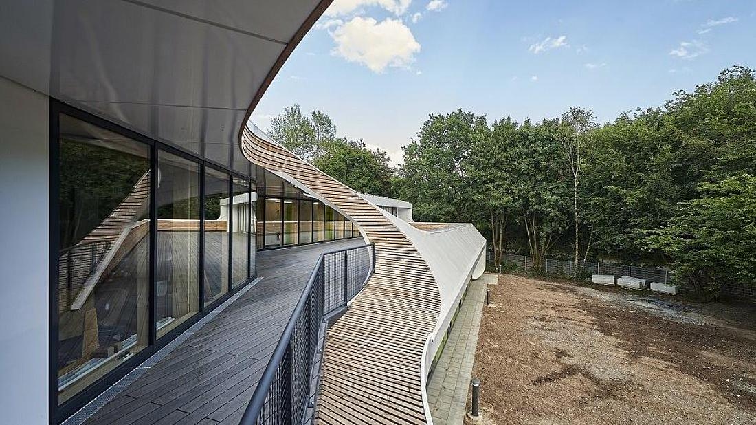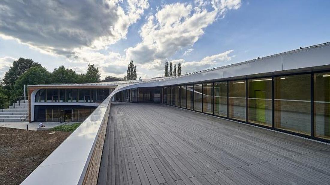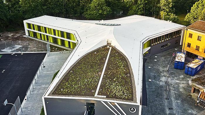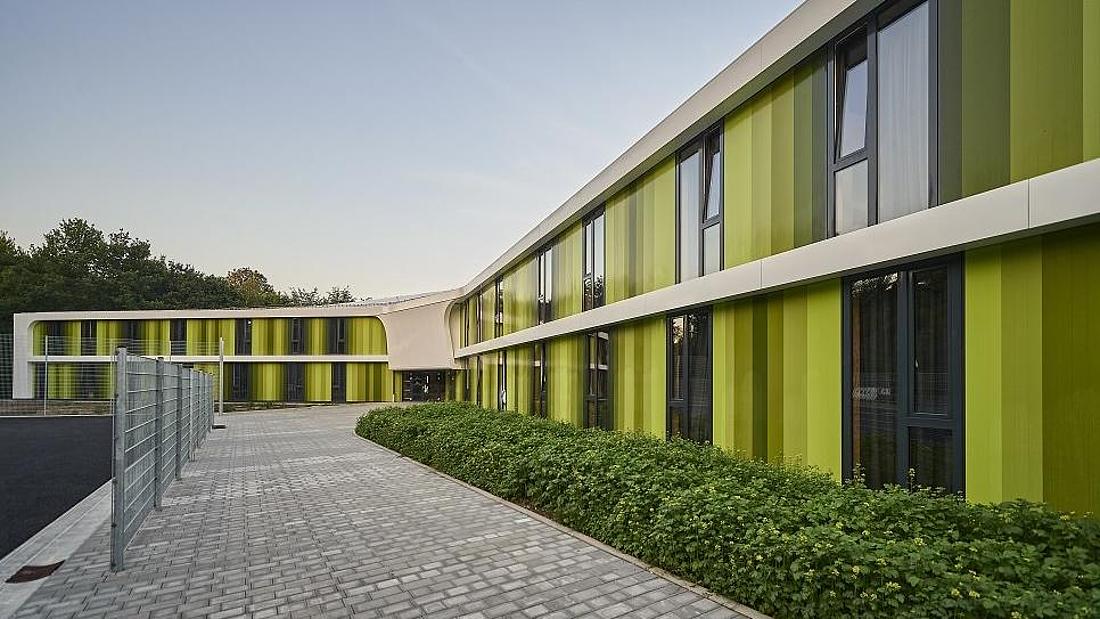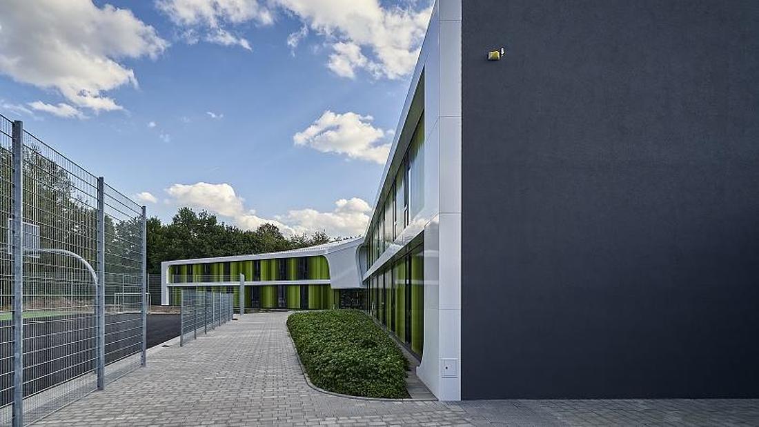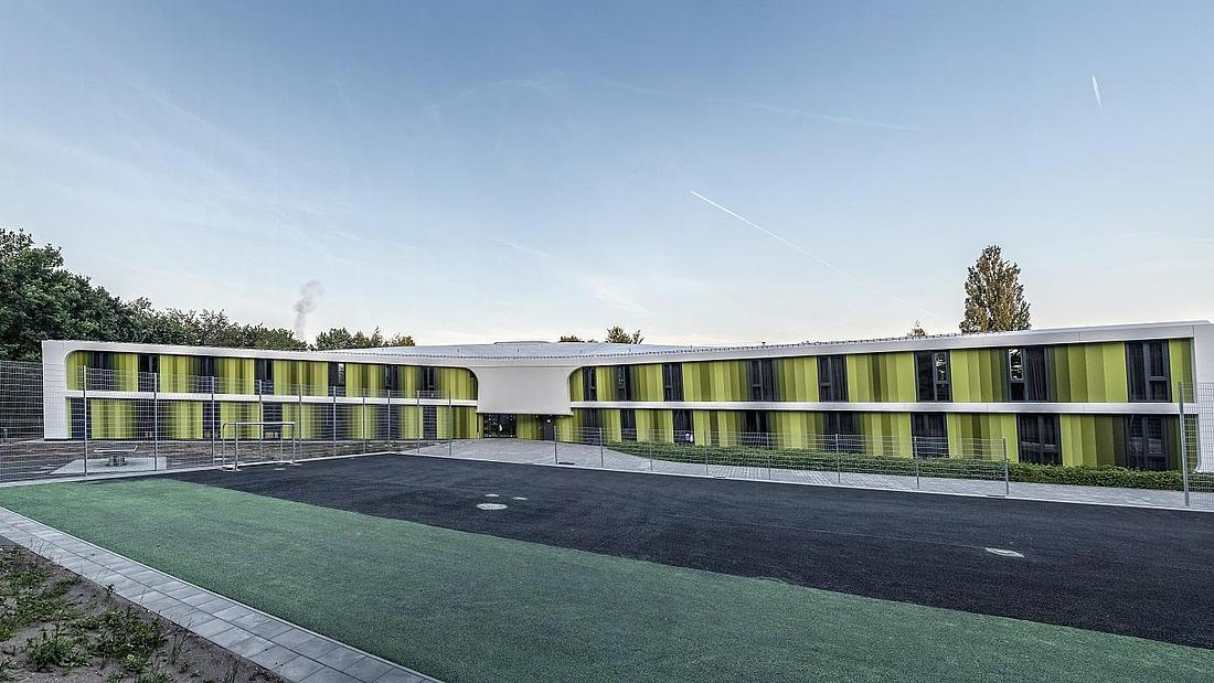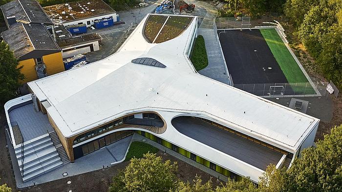 In Nachbarschaft zur Universität und einem Freibad auf einem großzügigen Grundstück gelegen, unterstreicht die niedrige Gebäudehöhe die gewollte Integration in die Topographie. Insbesondere die Nutzung der Zwischenflächen zwischen den drei Armen als Sportfeld, Abenteuerspielplatz und Vegetationszone, sowie die unterschiedlichen Zugänge zu diesen Bereichen bewirken eine starke Verbindung des Neubaus mit der Umgebung.