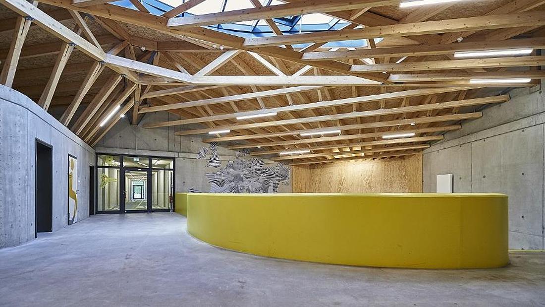 Auffallend auch das dynamisch geformte weiße Dach, dessen sichtbares, hölzernes Tragwerk zum Gestaltungselement wird. Es besteht aus Trägern, die außen und innen auf Wänden und entlang der Firstlinie und der Dachöffnung auf einem räumlichen Fachwerkträger aufliegen. Ein Trägergeflecht bildet die Sparrenebene, die im oberen Bereich die gekrümmte Dachfläche nachfährt. Über V-förmige Pfosten wurden die gegeneinander verschwenkten Trägerscharen in regelmäßigen Abständen verbunden, um eine räumliche Tragwirkung zu erzeugen. Umgesetzt hat das Tragwerk wie auch den gesamten Holzbau und alle weiteren Dach- und Fassadenarbeiten die Dieter Kohl GmbH aus Edelsfeld.